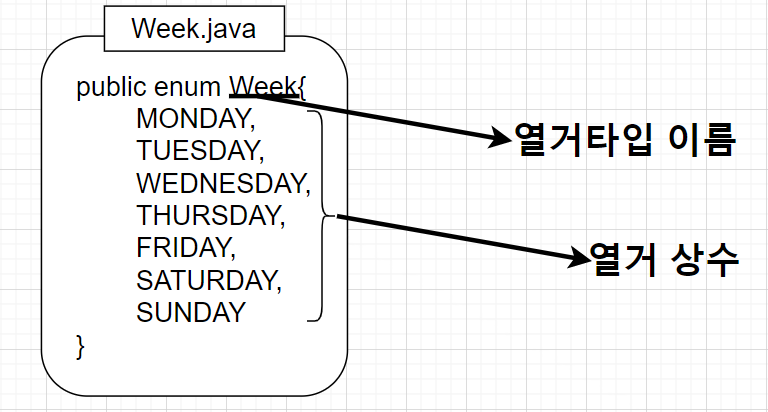 열거 타입 변수 Week의 경우 MONSDAY~SUNDAY까지의 열거 상수는 열거 객체로 생성된다.