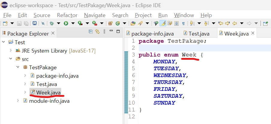 열거 타입을 사용할 패키지 이름을 확인하고 열거 타입 이름을 설정한다.